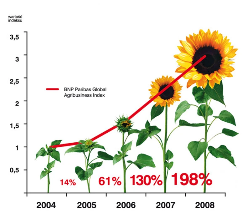 W warunkach rosnących cen żywności optymalnym wyborem wydają się więc inwestycje w rynek rolny. I to co najmniej w kilku powodów. Ponieważ żywność jest bezwzględnie artykułem pierwszej potrzeby, więc w warunkach "zaciskania pasa" przez konsumentów będzie towarem "pierwszego wyboru" w przeciwieństwie do artykułów przemysłowych. Brutalnie mówiąc, jeść muszą wszyscy, kupować nieruchomości, samochody czy telewizory już nie. Inwestycje w rynek rolny są również bardzo stabilne, a wszelkie wahnięcia znacznie częściej bywają korzystne dla inwestorów. O niesłychanym potencjale tego rynku mówią dane - indeks BNP Paribas firm sektora rolnego w ostatnich latach rośnie dynamicznie.