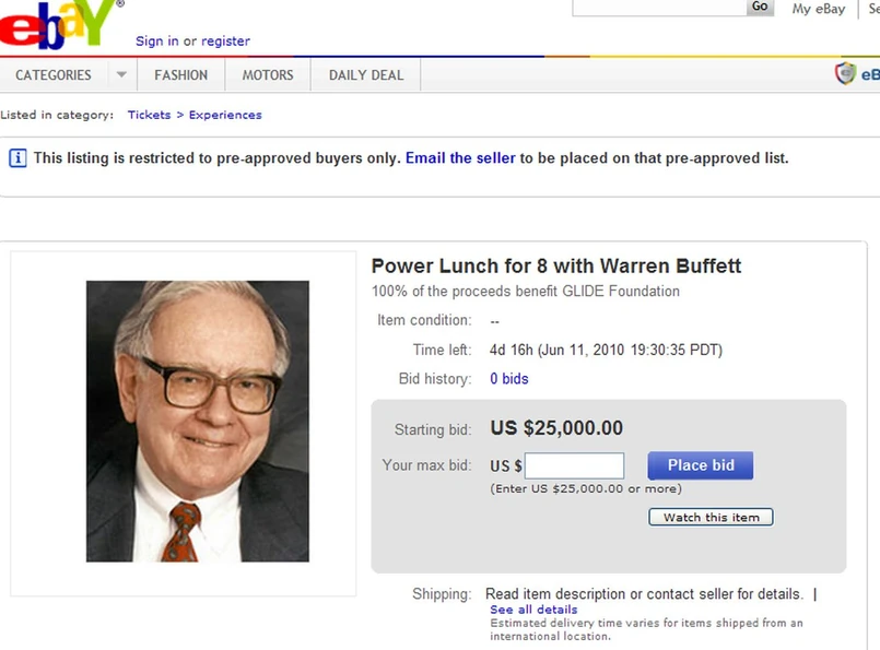 Warren Buffet postanowił pomóc tym, którym nie poszczęściło się tak jak jemu. Dlatego wystawił się na aukcję w internecie. Jeszcze przez cztery dni można więc licytować lunch z legendą giełdy. Wpisowe to 25 tysięcy dolarów, jednak nie ma się co łudzić, że za taką kwotę spotka się z miliarderem. W zeszłym roku, pewien chiński biznesmen zapłacił aż 1,68 miliona dolarów.