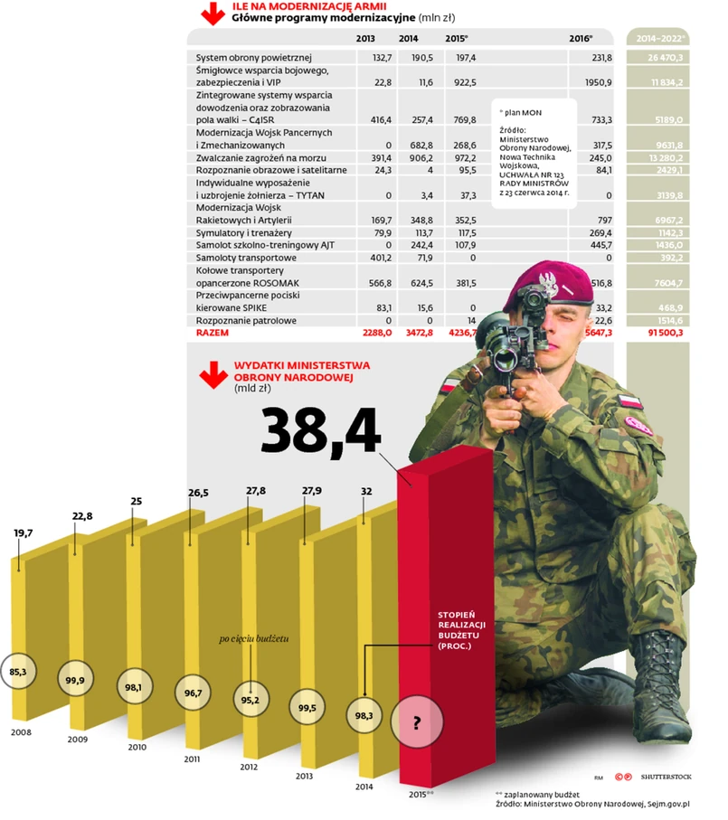 Można by wymienić jeszcze kilka przykładów tego, że polska modernizacja to poruszanie się po polu minowym, jednak przed nami prawdziwy rów przeciwczołgowy, w którym można utknąć, czyli wątek finansowy. Zakładając, że resort obrony zrealizuje tegoroczny budżet modernizacyjny, to w sumie na 14 programów modernizacyjnych zostanie wydane 10 mld zł przez trzy lata. Patrząc na wspominaną uchwałę rządu, do wydania zostanie jeszcze ponad 80 mld zł przez siedem lat. Wychodzi, że co miesiąc powinniśmy wydawać na nowy sprzęt wojskowy prawie 1 mld zł. Takie założenie jest mało realne z kilku powodów. Po pierwsze, jak na razie nie potrafimy podpisać takiej liczby umów, by faktycznie wydawać te pieniądze. I choć program modernizacji zaczął już trzeci rok, to nie widać, by nagle finalizowanie kontraktów radykalnie przyspieszyło. W dużej mierze winę ponoszą za to politycy, którym w niektórych programach brakuje konsekwencji i potrafią wywrócić do góry nogami projekt, który jest już zaawansowany, co oznacza powrót na początek. Niemniej jednak biurokracja MON i Inspektoratu Uzbrojenia oraz strach przed podejmowaniem decyzji także mają tu swoje znaczenie. Drugą kwestią jest to, że bez radykalnego zwiększenia budżetu resort nie będzie w stanie wydawać takich pieniędzy. Zgodnie z planem budżetu na 2016 r. na wszystkie wydatki majątkowe ma wynieść niecałe 30 proc. budżetu (warto pamiętać, że 50 proc. MON wydaje na pensje, renty oraz emerytury żołnierzy). W zaokrągleniu można powiedzieć, że będzie to ok. 10 mld zł. Jednak jest to kwota wydawana na wszystkie wydatki majątkowe, również remonty budynków czy sprzętu nieuwzględnionego w 14 programach operacyjnych.