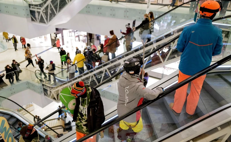 Koronawirus w Polsce. Kilkadziesiąt osób w pełnych strojach i z ekwipunkiem narciarskim protestowało w Galerii Katowickiej w Katowicach. Sprzeciw dotyczył decyzji rządu, która umożliwiła działanie galerii handlowych, utrzymując jednocześnie zamknięcie stoków narciarskich.