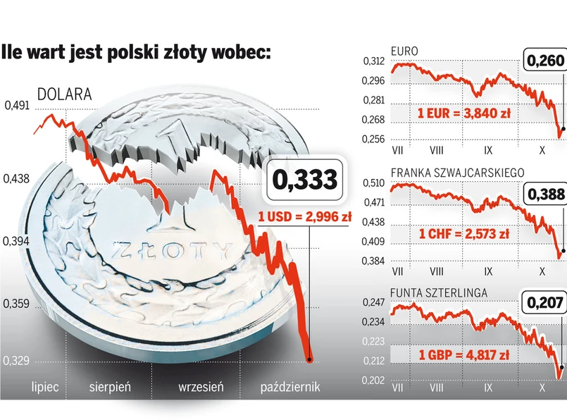 Złotówka w ciągu kilku godzin straciła wczoraj na wartości prawie 5 proc. W południe padła psychologiczna granica 3 zł za dolara, brytyjski funt przebił granicę 5 zł, jedynie dwóch groszy zabrakło euro do poziomu 4 zł - nasza waluta tak tania ostatni raz była ponad dwa lata temu. Na ratunek ruszyły rząd i NBP, których przedstawiciele zgodnie deklarowali, że kondycja polskiej gospodarki jest dobra, a osłabienie złotego - chwilowe. Po tych zapewnieniach rynek się trochę uspokoił - o godz. 16 za jedno euro płacono 3,88 zł, dolar kosztował 3,03 zł, zaś funt - 4,87 zł.