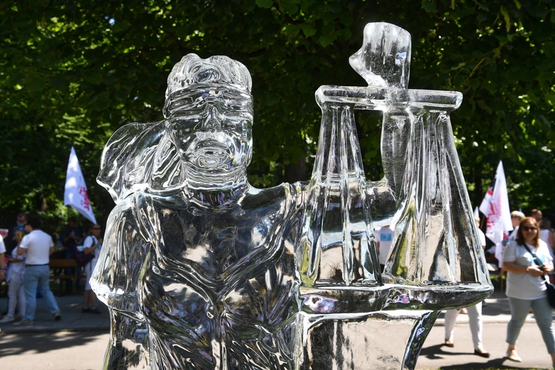 Przed budynkiem Kancelarii Premiera stanęła też dwumetrowa lodowa rzeźba Temidy, która topiła się w słońcu. Figura – jak mówili manifestujący - symbolizuje planowane zamrożenie płac i jego skutki.