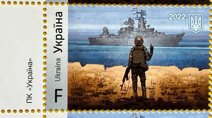 Znajdujący się na znaczku cytat to słowa jednego z obrońców Wyspy Węży na Morzu Czarnym, który w pierwszej fazie rosyjskiej agresji na Ukrainę była atakowana przez krążownik Moskwa. Gdy załoga rosyjskiego okrętu wezwała obrońców wyspy do poddania się, jeden z ukraińskich żołnierzy odpowiedział w niewybrednych słowach, dokąd mają się udać napastnicy. Słowa stały się jednymi z najbardziej rozpowszechnionych cytatów w trakcie agresji Rosji na Ukrainę i tak zwanym wiralem.