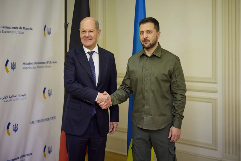 Kanclerz Niemiec Olaf Scholz podczas spotkania w Nowym Jorku ponownie obiecał prezydentowi Ukrainy Wołodymyrowi Zełenskiemu wsparcie w wojnie obronnej przeciwko Rosji. Obaj politycy, którzy uczestniczą w sesji Zgromadzenia Ogólnego ONZ, zostali także uhonorowani nagrodą za zasługi dla współpracy międzynarodowej.