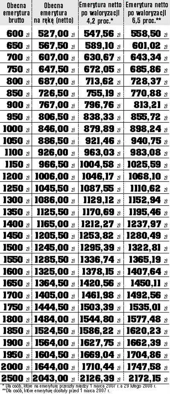 Począwszy od tego roku renty i emerytury będą rewaloryzowane co roku (w marcu), a nie – jak dotychczas – gdy inflacja od ostatniej waloryzacji przekroczy 5 proc. Wskaźnik waloryzacji będzie obejmował nie tylko wzrost cen, ale też co najmniej 20 proc. realnego wzrostu płac. W tym roku wskaźnik uwzględni wzrost cen i płac na lata 2006 – 2007, a wysokość świadczeń wzrośnie o około 6,5 proc., natomiast emerytury i renty przyznane w okresie od 1 marca 2007 r. do 29 lutego tego roku wzrosną o 4,2 proc. Nowe przepisy o corocznej waloryzacji zlikwidowały wypłatę specjalnych dodatków do świadczeń. Były one wypłacane tylko w tym roku, w którym nie była przeprowadzana waloryzacja. Ponieważ waloryzacja będzie przeprowadzana co roku, nie będzie już wypłaty dodatków.